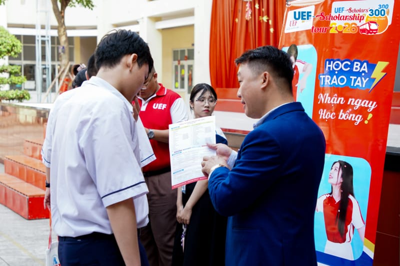 Bên cạnh hoạt động trao học bổng, UEF cũng triển khai tư vấn tuyển sinh - hướng nghiệp ngay tại trường, cung cấp các thông tin quan trọng liên quan đến kỳ thi tốt nghiệp THPT, phương thức xét tuyển năm 2026, chương trình đào tạo và môi trường học tập tại UEF. Thông qua các hoạt động tương tác trực tiếp, học sinh có thêm cơ sở để lựa chọn ngành học phù hợp với năng lực và mục tiêu cá nhân.