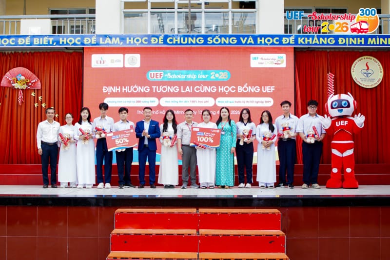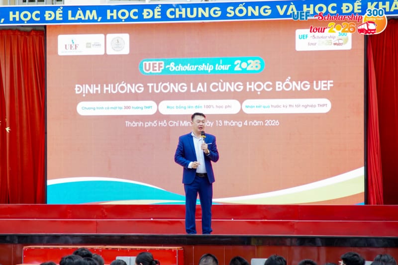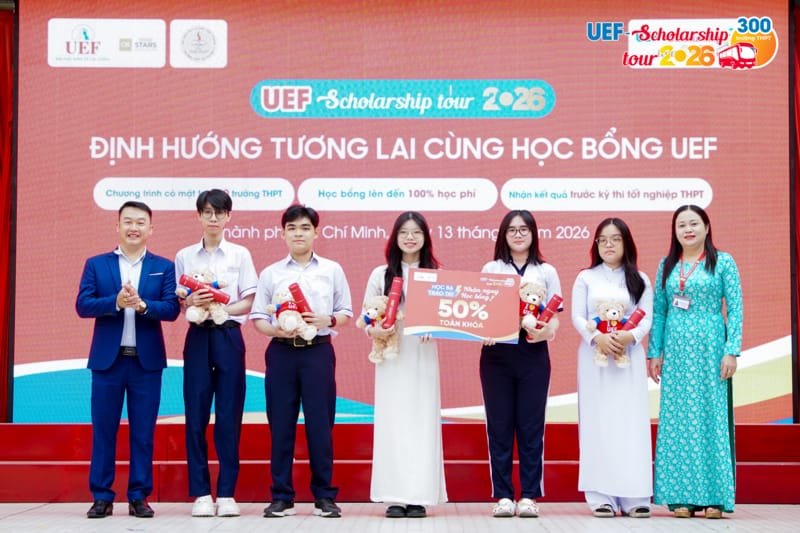 Nối dài hành trình UEF Scholarship Tour 2026 tại tuyến TP.HCM, sáng ngày 13/4, UEF đã có mặt tại Trường THPT Võ Thị Sáu để trực tiếp trao 10 suất học bổng có giá trị từ 50% đến 100% cho các bạn học sinh lớp 12 có thành tích học tập nổi bật và chủ động nắm bắt cơ hội từ chính sách học bổng sớm của Nhà trường.