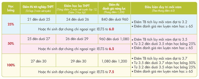 Hằng năm, UEF dành hàng chục tỷ đồng để trao học bổng cho thí sinh đạt kết quả tuyển sinh đầu vào cao. Nếu đạt số điểm xét tuyển theo quy định, các bạn có thể nhận học bổng tuyển sinh lên đến 100%. Chi tiết các mức học bổng theo bảng dưới đây.