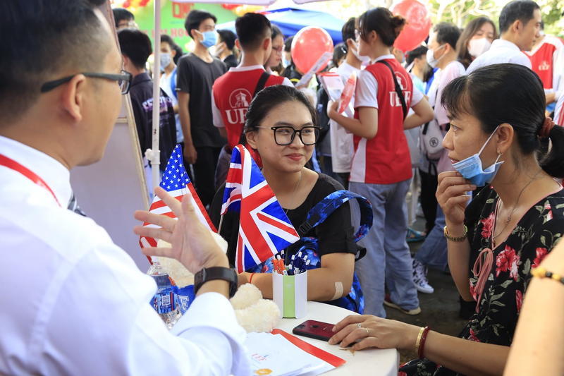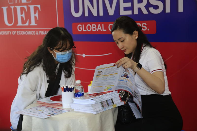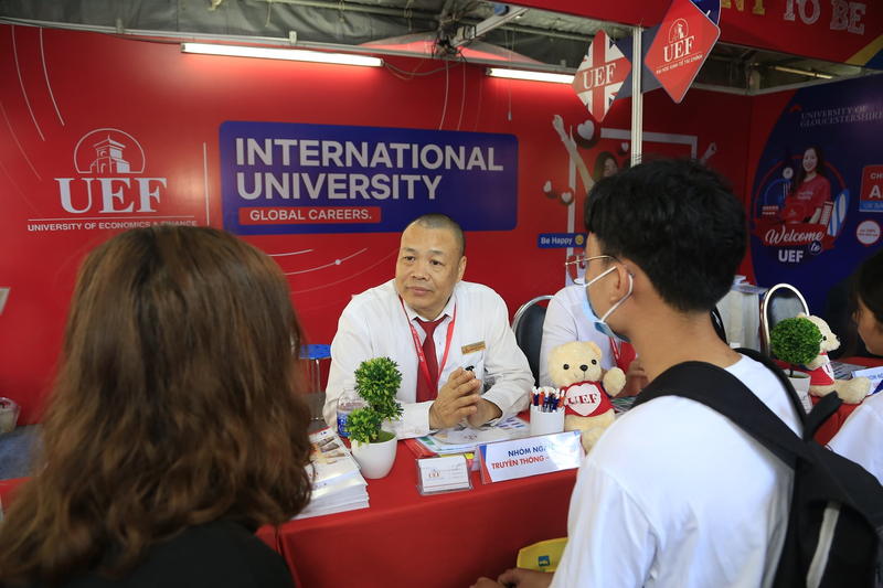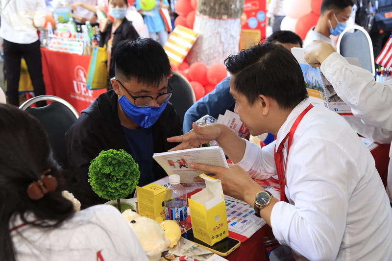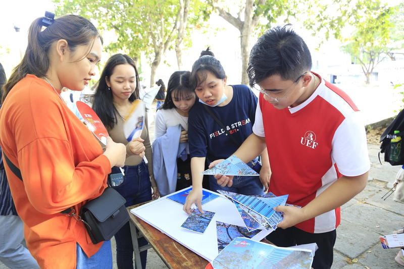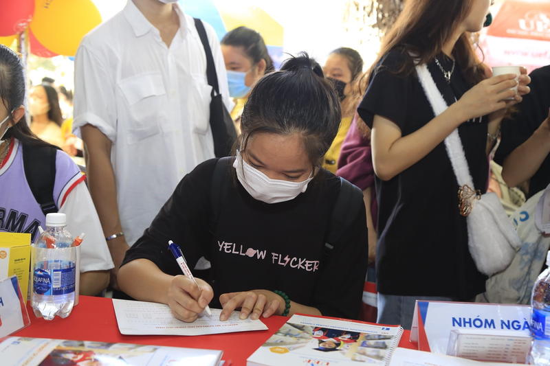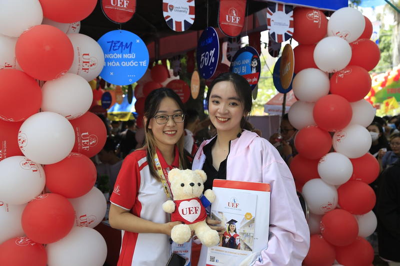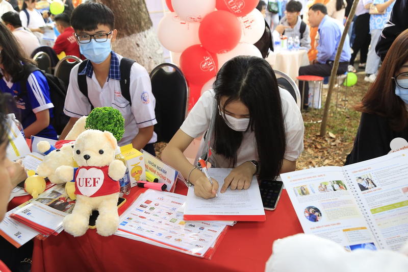 Cách bày trí bắt mắt với những câu chữ gắn liền xu hướng giới trẻ hiện nay, gian tư vấn tại số 54, 55 của UEF đã “chào đón” đông đảo 2k3 đến tham quan và tìm hiểu. Nhiều thắc mắc của các bạn xoay quanh các vấn đề về phương thức tuyển sinh, chương trình đào tạo song ngữ, chính sách học bổng, học phí, hoạt động sinh viên, chương trình quốc tế,… đã được ban tư vấn giải đáp cặn kẽ, chi tiết.
