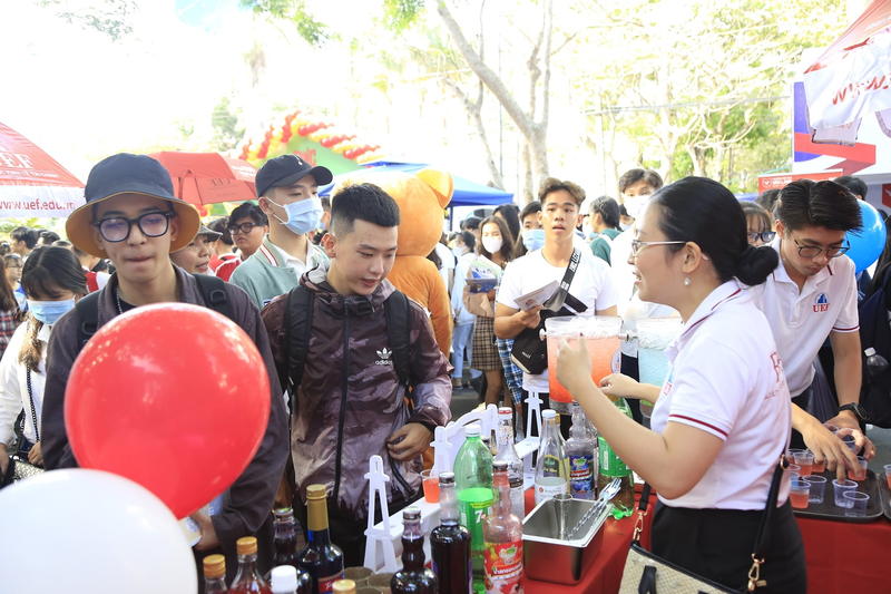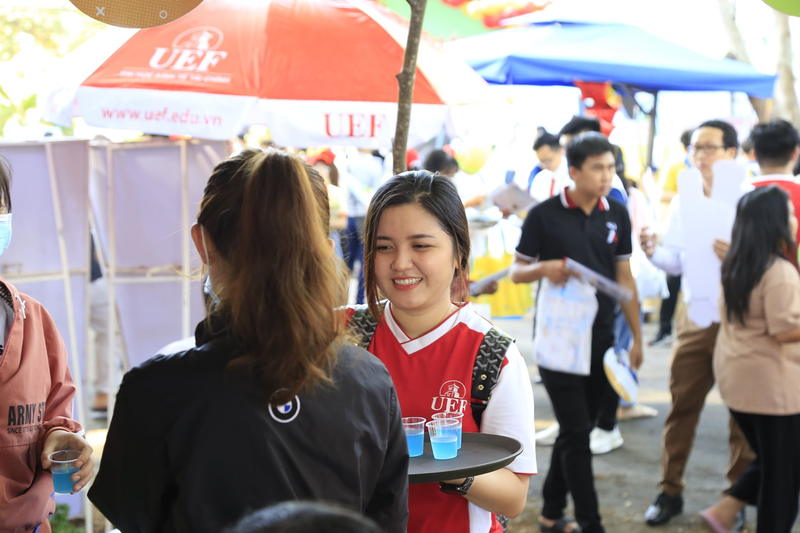 Bên cạnh việc được tìm hiểu sâu về môi trường học tập, các bạn học sinh còn được thưởng thức những ly nước mát lành giữa thời tiết nóng bức đến từ các anh/chị sinh viên của trường. Tại đây, các bạn cũng được nghe những trải nghiệm học tập thực tế từ UEFers. Ngoài ra, nhiều bạn còn mang về những phần quà dễ thương, hấp dẫn từ các trò chơi vận động.