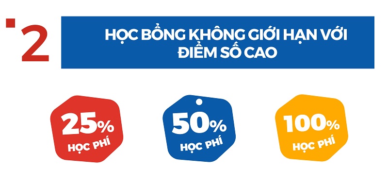 Trong đó, thí sinh xét tuyển vào UEF theo phương thức học bạ 5 học kỳ với mức điểm từ 35 đến dưới 43 điểm sẽ học được học bổng 25%; đạt mức điểm từ 43 đến dưới 46 điểm sẽ nhận được học bổng 50%. Thí sinh đạt mức điểm từ 46 trở lên sẽ nhận được học bổng 100%. Học bổng này sẽ cấp cho năm đầu tiên, những năm tiếp theo sinh viên dùng điểm học tập để tiếp tục duy trì học bổng. Ngoài ra, thí sinh xét tuyển ở các ngành học xu hướng: Công nghệ thông tin, Thương mại điện tử, Ngôn ngữ Nhật, Ngôn ngữ Hàn Quốc, Ngôn ngữ Trung Quốc, Công nghệ truyền thông, Quan hệ công chúng, Quan hệ quốc tế, Khoa học dữ liệu sẽ được nhận suất học bổng 40% học phí trong toàn khóa học.