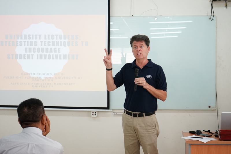 PGS.TS Giáo dục học Darryn Diuguid (Đại học McKrendee Mỹ), học giả Fullbright (Việt Nam), diễn giả buổi hội thảo đã nhiệt tình chia sẻ cùng quý thầy cô về phương pháp giảng dạy và cách truyền cảm hứng cho người học hiện nay, đồng thời cũng chỉ ra điểm khác biệt trong phương pháp giảng dạy trước đây với hiện tại. Thông qua những tình huống thú vị, quý thầy cô đến tham dự đã nhiệt tình tương tác, trao đổi với diễn giả để cùng hướng đến tìm ra phương pháp giảng dạy tiếng Anh phù hợp nhất.