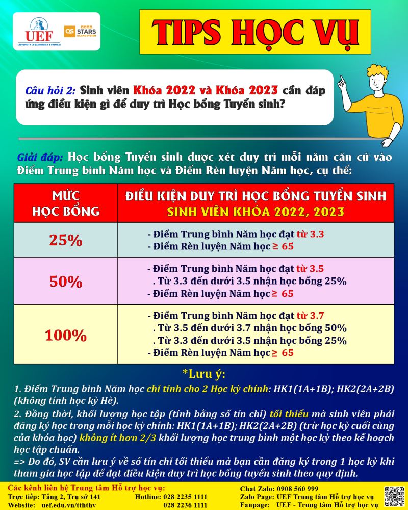 Bên cạnh các vấn đề nổi bật nêu trên, nếu bạn có thắc mắc hoặc cần thêm thông tin gì về điều kiện duy trì Học bổng Tuyển sinh, hãy liên hệ ngay với Trung tâm Hỗ trợ học vụ để được tư vấn và giải đáp cụ thể nhé!