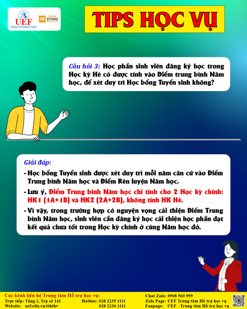 Câu hỏi 3: Học phần sinh viên đăng ký học trong Học kỳ Hè có được tính vào Điểm trung bình Năm học, để xét duy trì Học bổng Tuyển sinh không?