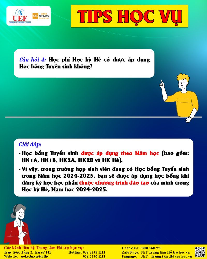 Câu hỏi 4: Học phí Học kỳ Hè có được áp dụng Học bổng Tuyển sinh không?