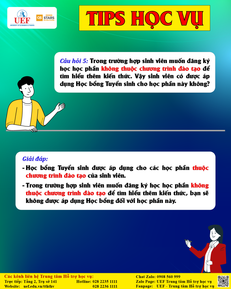 Câu hỏi 5: Trong trường hợp sinh viên muốn đăng ký học học phần không thuộc chương trình đào tạo để tìm hiểu thêm kiến thức. Vậy sinh viên có được áp dụng Học bổng Tuyển sinh cho học phần này không?
