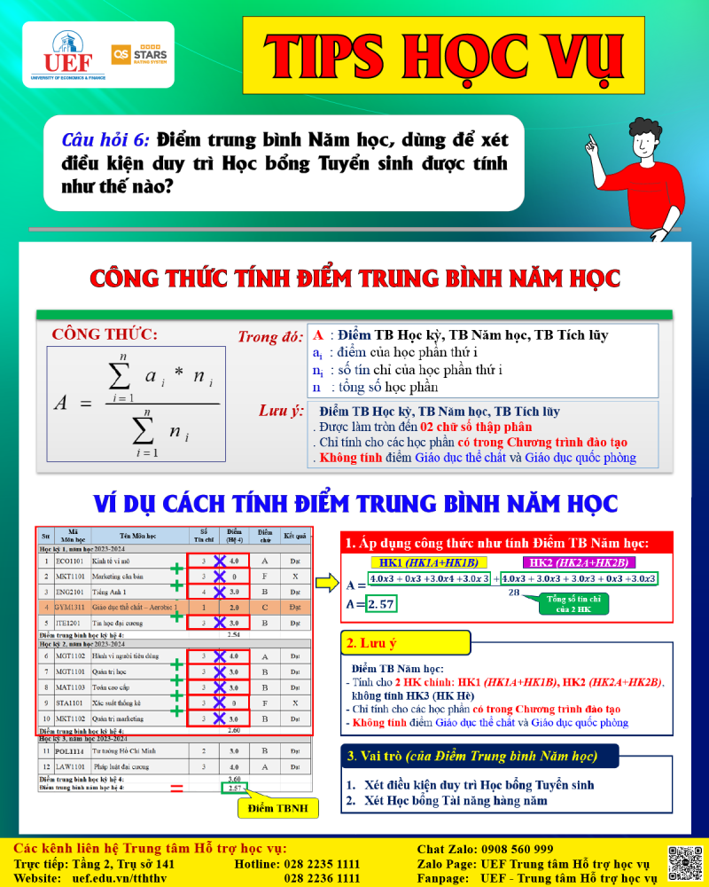 Câu hỏi 6: Điểm trung bình Năm học, dùng để xét điều kiện duy trì Học bổng Tuyển sinh được tính như thế nào?