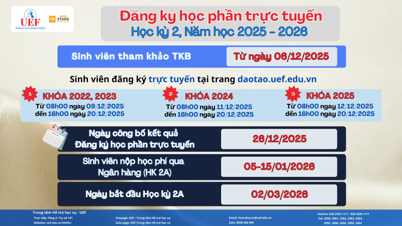 - Sinh viên tham khảo Thời khóa biểu vào ngày 06/12/2025 tại trang https://daotao.uef.edu.vn → Các bạn hãy truy cập để lên kế hoạch cho học kỳ mới nhé!