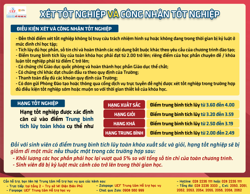 Sinh viên được Nhà trường xét và công nhận tốt nghiệp khi hoàn thành chương trình đào tạo và có đủ các điều kiện xét tốt nghiệp. Hạng tốt nghiệp được xác định căn cứ vào Điểm trung bình tích lũy toàn khóa như sau: