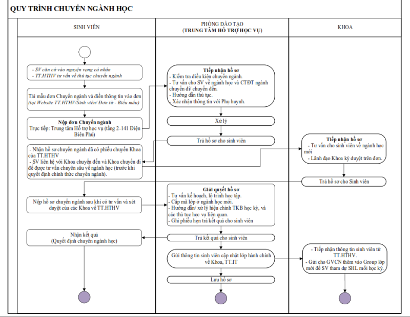 B6: Sinh viên nhận kết quả theo lịch hẹn tại TT.HTHV, sau đó liên hệ Khoa để được hỗ trợ tham gia vào group lớp hành chính mới.