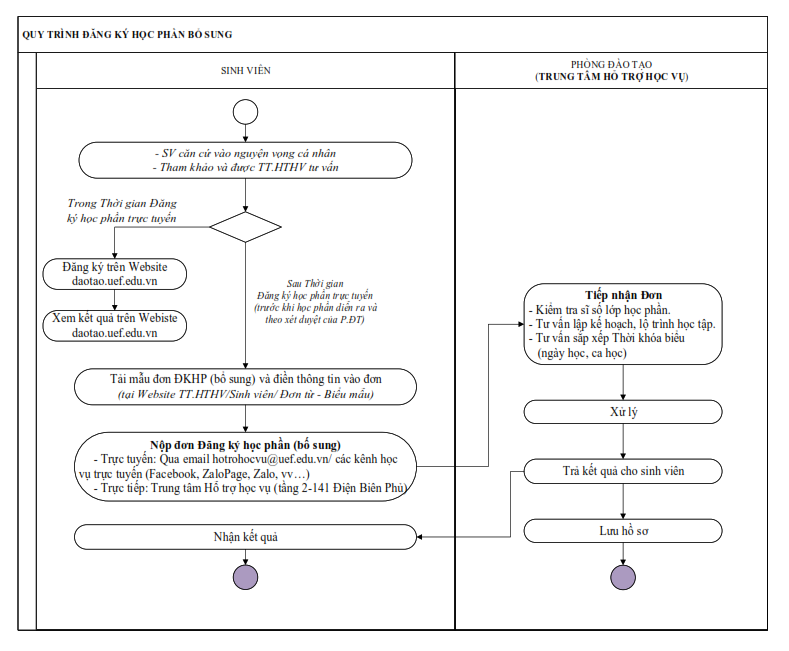 + Nếu SV gửi yêu cầu qua cổng dịch vụ trực tuyến (daotao.uef.edu.vn)/ hoặc các kênh học vụ trực tuyến (Mail, Facebook, ZaloPage, Zalo) -> thì nhận kết quả phản hồi từ TT.HTHV sau 1-2 ngày làm việc, nhằm tư vấn cho sinh viên về CTĐT, lộ trình học song ngành.