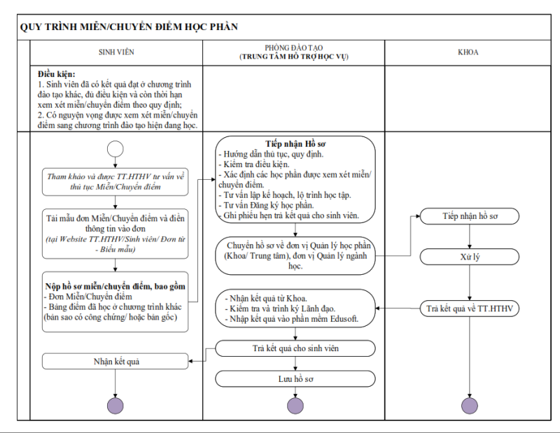 - Hội đồng chuyên môn của Trường xem xét công nhận, chuyển đổi tín chỉ trên cơ sở đối sánh chuẩn đầu ra, nội dung và khối lượng học tập, cách thức đánh giá học phần và các điều kiện đảm bảo chất lượng thực hiện chương trình