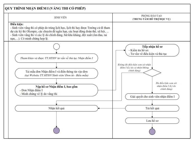 - Trường hợp 1: Vắng thi có phép do trùng lịch học, lịch thi hay được Trường cử đi tham dự các kỳ thi Olympic, các chuyên đề ngắn hạn, các hoạt động đoàn thể, xã hội,… thì sinh viên phải làm đơn đề nghị được nhận điểm I ngay khi sự việc phát sinh kèm theo các xác nhận cần thiết, không trễ hơn ngày xin được vắng thi.