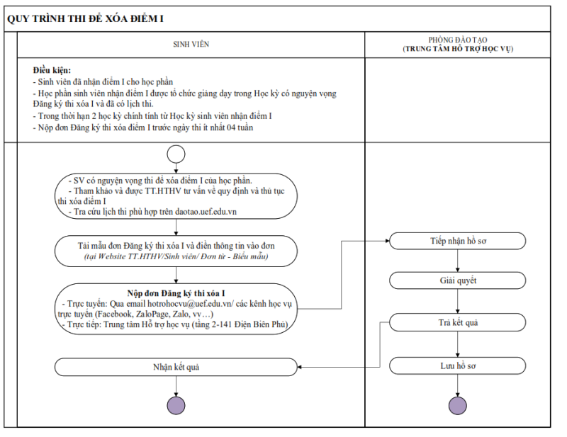 Lưu ý: Trong vòng 02 học kỳ chính tiếp theo kể từ học kỳ xin nhận điểm I, trước mỗi kỳ thi sinh viên chủ động kiểm tra lịch thi trên trang daotao.uef.edu.vn và liên hệ Phòng Đào Tạo để nộp đơn xin đăng ký thi để xóa điểm I. Nếu không thi xóa điểm I, sẽ nhận điểm F cho học phần này