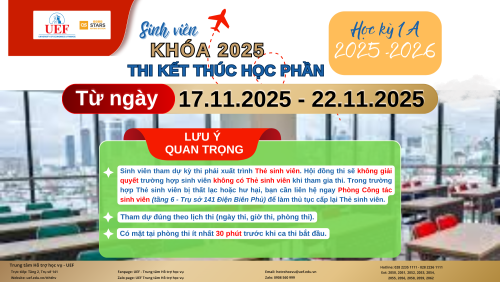 Sinh viên Khóa 2025 bắt đầu Học kỳ 1A, Năm học 2025-2026 từ ngày 15/09/2025. Sinh viên truy cập vào daotao.uef.edu.vn để tra cứu THỜI KHÓA BIỂU chi tiết.