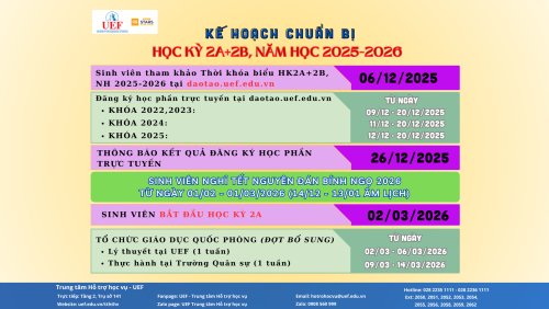 Căn cứ vào kế hoạch năm học, Phòng Đào tạo thông báo Kế hoạch chuẩn bị cho Học kỳ 2A và 2B, năm học 2025-2026 đến các bạn sinh viên UEF. Các bạn hãy lưu lại những mốc...