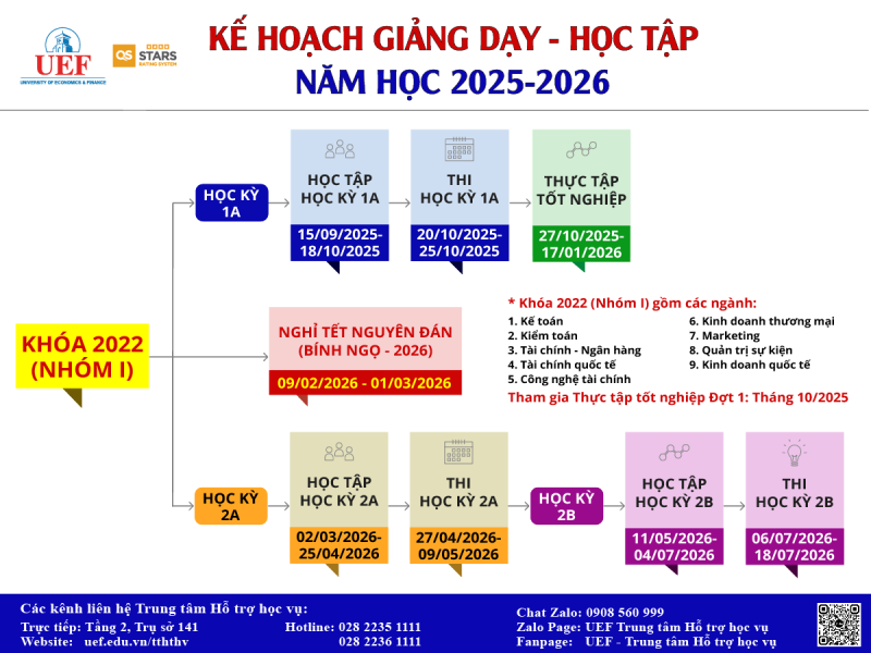 - Sinh viên Khóa 2022 (Nhóm I): Gồm các ngành Kế toán, Kiểm toán, Tài chính - Ngân hàng, Tài chính quốc tế, Công nghệ tài chính, Kinh doanh thương mại, Marketing, Quản trị sự kiện, Kinh doanh quốc tế. Tham gia Thực tập tốt nghiệp Đợt 1 (Tháng 10/2025).