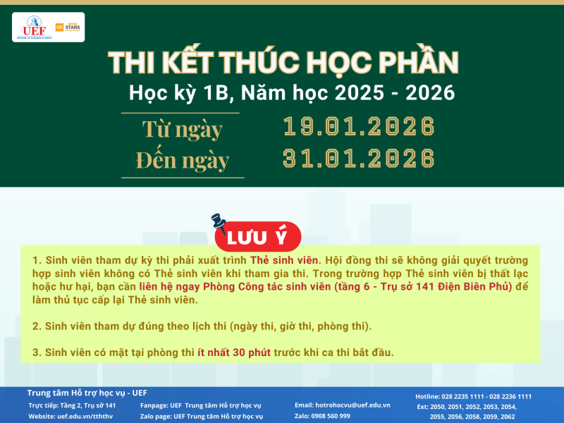 Kỳ thi kết thúc học phần - Học kỳ 1B, Năm học 2025-2026 diễn ra từ ngày 19/01/2026 đến ngày 31/01/2026.