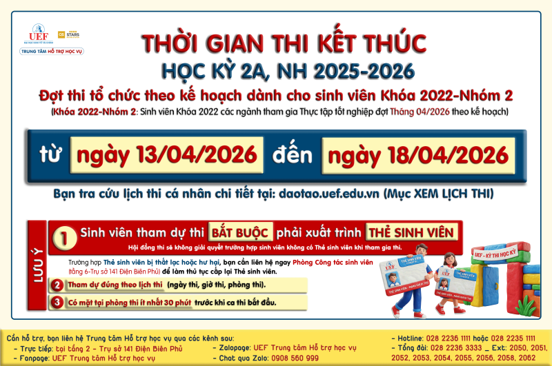 Vậy là một chặng đường học tập của học kỳ 2A đã dần khép lại. Căn cứ theo Kế hoạch, Trung tâm Hỗ trợ học vụ mến Lưu ý Thời gian Thi kết thúc Học kỳ 2A/ NH 2025-2026 như sau:
