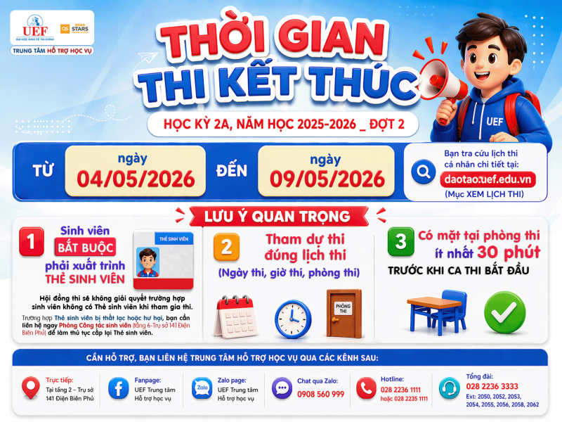 Thấm thoát thoi đưa, thoắt cái chúng ta đã đi đến những ngày cuối cùng của Học kỳ 2A. Trung tâm Hỗ trợ học vụ mến Lưu ý các bạn Thời gian Thi kết thúc HK 2A/ NH 2025-2026 như sau: