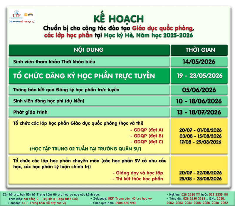 LƯU Ý: Sinh viên Khóa 2023 (chưa hoàn thành Giáo dục Quốc phòng) chủ động sắp xếp và tham gia học tập Giáo dục Quốc phòng tại Học kỳ Hè/ NH 2025-2026, nhằm có thể đủ điều kiện Xét tốt nghiệp đúng tiến độ trong Năm học 2026-2027!