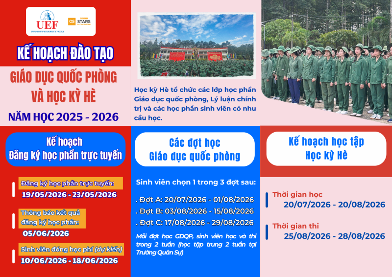 Học kỳ Hè tổ chức các lớp học phần Giáo dục quốc phòng, Lý luận chính trị và các học phần sinh viên có nhu cầu học.