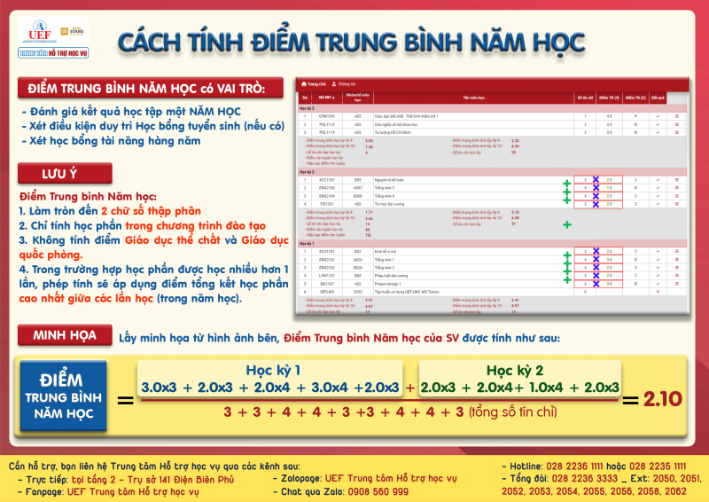 Điểm Trung bình năm học được tính căn cứ theo kết quả học tập của các học phần sinh viên đã học trong năm học, gồm các học kỳ chính (HK 1A, 1B, 2A, 2B), không tính học kỳ Hè.
