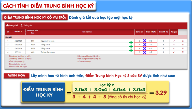 Điểm trung bình học kỳ được tính toán dựa trên thang điểm 4 và là kết quả của tổng điểm hệ 4 của từng học phần nhân với số tín chỉ tương ứng, sau đó chia cho tổng số tín chỉ mà bạn đã đăng ký trong học kỳ đó.