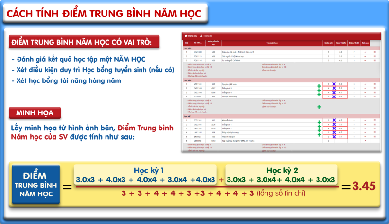 Bên cạnh việc theo dõi từng học kỳ, điểm trung bình năm học đóng vai trò then chốt trong việc đánh giá toàn diện kết quả học tập của bạn trong suốt một năm học (chỉ tính các học kỳ chính: HK 1A, 1B, 2A, 2B và không tính học kỳ hè), đồng thời là căn cứ quan trọng để Nhà trường xét điều kiện duy trì học bổng tuyển sinh, cũng như các loại học bổng tài năng hàng năm.