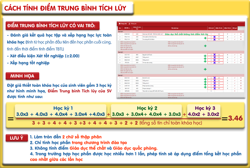 Điểm trung bình tích lũy được tính toán dựa trên tổng điểm hệ 4 của tất cả các học phần đã hoàn thành trong chương trình đào tạo tính đến thời điểm xét, nhân với số tín chỉ tương ứng của từng môn và chia cho tổng số tín chỉ tích lũy.