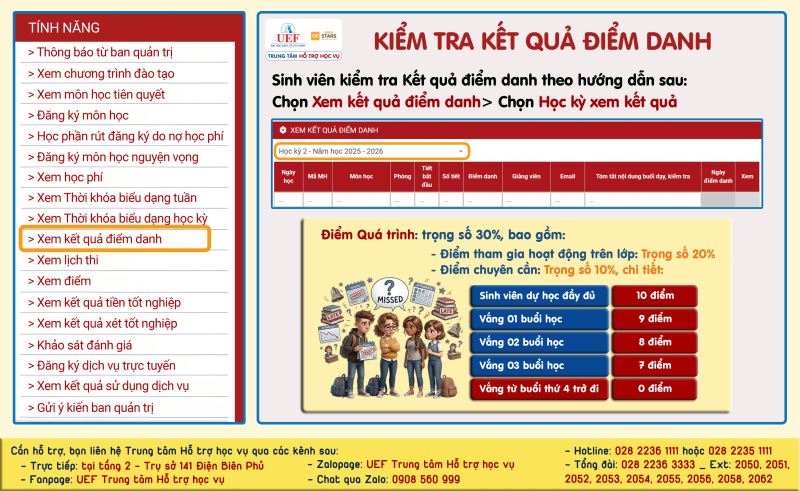 Sinh viên vắng học từ buổi thứ 4 trở đi, sẽ bỏ lỡ hoàn toàn điểm chuyên cần. Đây là phần điểm chiếm 10% trong tổng điểm môn học, nhằm ghi nhận tinh thần và thái độ học tập của mỗi UEFer.