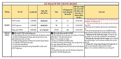 Trung tâm Tin học - Ngoại ngữ UEF gửi các bạn Thông báo Kế hoạch thi và cấp chứng chỉ tiếng Anh và Tin học ứng dụng CNTT tháng 08 năm 2025
