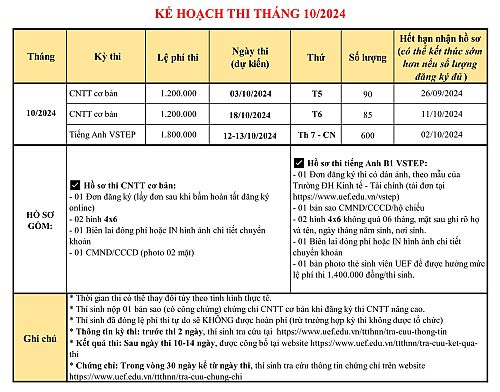 Trung tâm Tin học - Ngoại ngữ UEF gửi các bạn Thông báo Kế hoạch thi và cấp chứng chỉ tiếng Anh và Tin học ứng dụng CNTT tháng 10 năm 2024