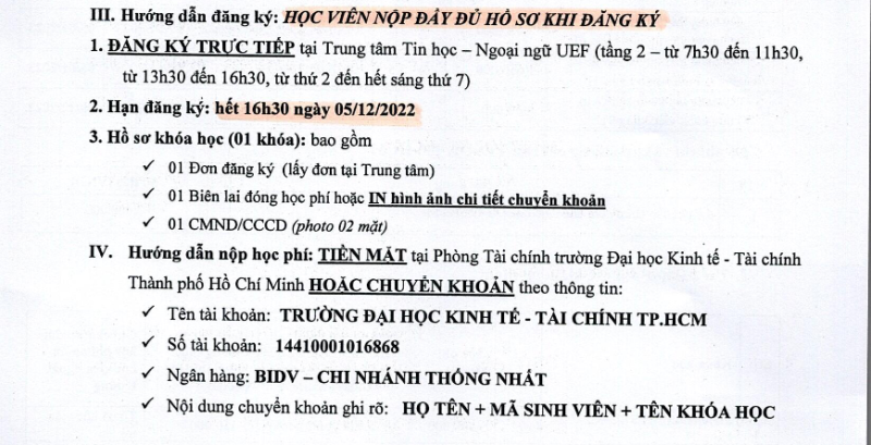 ĐĂNG KÝ TRỰC TIẾP tại Trung tâm Tin học – Ngoại ngữ UEF (tầng 2 – từ 7h30 đến 11h30, từ 13h30 đến 16h30, từ thứ 2 đến hết sáng thứ 7)