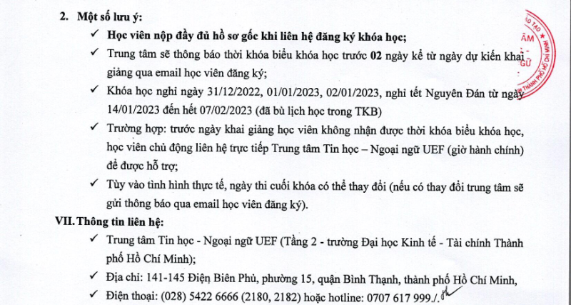 Trung tâm Tin học – Ngoại ngữ UEF thông báo về việc chiêu sinh các khóa học kỹ năng mềm và khóa học tự chọn tháng 12/2022 Học viên tham khảo thông báo chiêu sinh các khóa học kỹ năng mềm và khóa học tự chọn tháng 12/2022 tại ĐÂY Đăng ký: