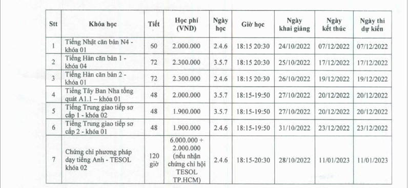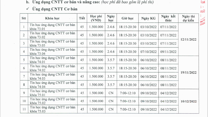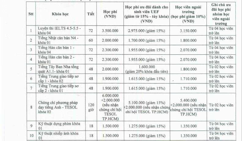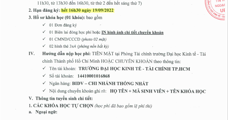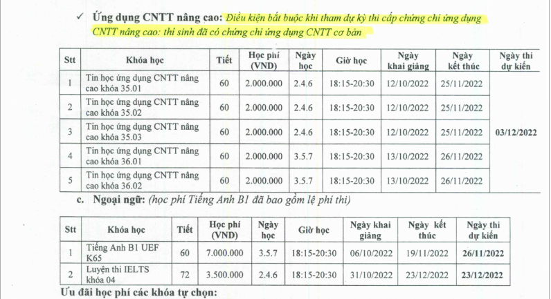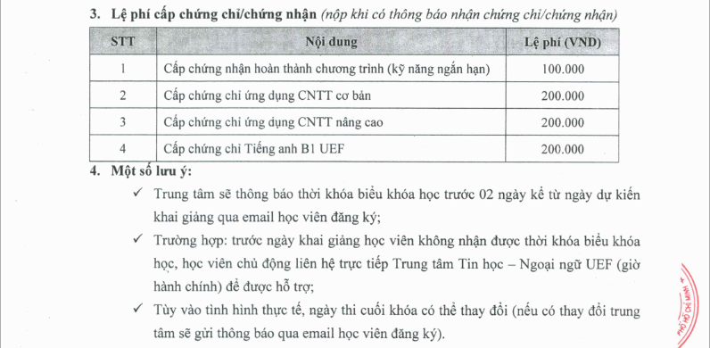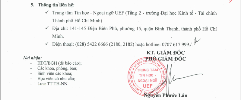 Trung tâm Tin học – Ngoại ngữ UEF thông báo về việc chiêu sinh các khóa học ngắn hạn tháng 9+10+11 năm 2022, cụ thể như sau: Học viên tham khảo thông báo tuyển sinh khóa học tháng 9+10+11/2022 (Hình thức học và thi trực tiếp) tại ĐÂY Đăng ký: ĐĂNG KÝ TRỰC TIẾP tại Trung tâm Tin học – Ngoại ngữ UEF (tầng 2 – từ 7h30 đến 11h30, từ 13h30 đến 16h30, từ thứ 2 đến hết sáng thứ 7) Hạn đăng ký:hết 16h30 NGÀY 19/09/2022 Trân trọng./.