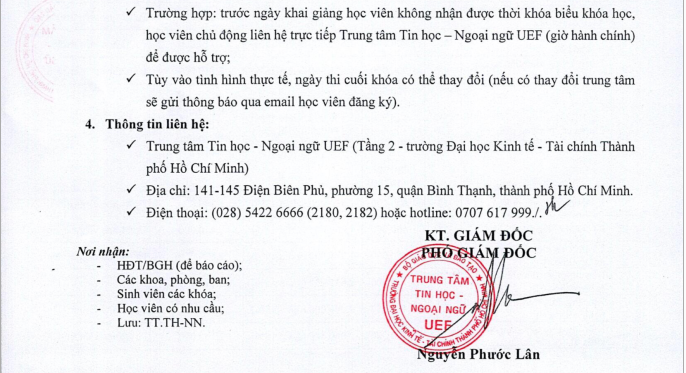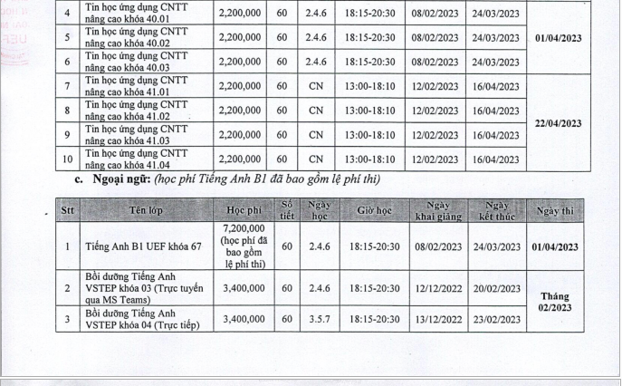 Đối với các khóa chuẩn đầu ra:ĐĂNG KÝ TRỰC TIẾP tại Trung tâm Tin học – Ngoại ngữ UEF (tầng 2 – từ 7h30 đến 11h30, từ 13h30 đến 16h30, từ thứ 2 đến hết sáng thứ 7)
