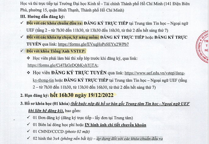 - Học viên ĐĂNG KÝ TRỰC TUYẾN qua link: https://www.uef.edu.vn/vstep/dang-ky-thong-tin hoặc ĐĂNG KÝ TRỰC TIẾP tại Trung tâm Tin học – Ngoại ngữ UEF (tầng 2 – từ 7h30 đến 11h30, từ 13h30 đến 16h30, từ thứ 2 đến hết sáng thứ 7)