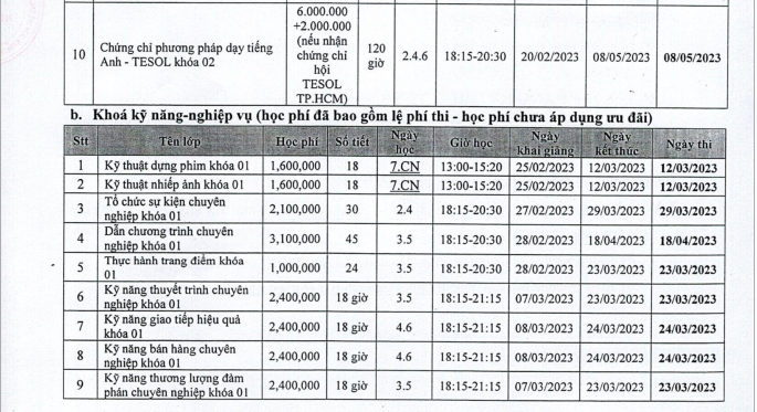 Lịch chiêu sinh khóa học ngắn hạn tháng 12/2022, tháng 01+02/2023
