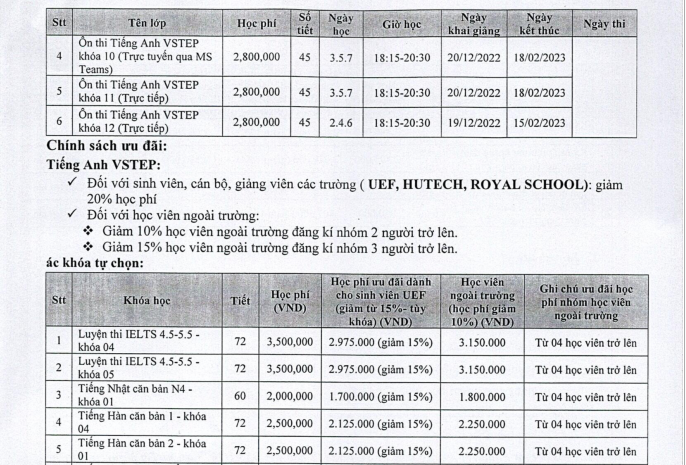 Trung tâm Tin học – Ngoại ngữ UEF thông báo về việc lịch chiêu sinh khóa học ngắn hạn tháng 12/2022, tháng 01+02/2023