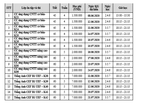 Nhằm đáp ứng chuẩn đầu ra về Tin học & Tiếng Anh của nhà trường, Trung tâm Tin học - Ngoại ngữ - Kỹ năng thông báo lịch khai giảng dự kiến các lớp ngắn hạn tháng 6&7/2020 đến toàn thể sinh viên trường Đại học Kinh tế - Tài chính thành phố Hồ Chí Minh