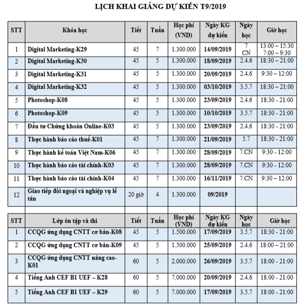 Lịch khai giảng dự kiến các khóa học ngắn hạn tháng 9 năm 2019