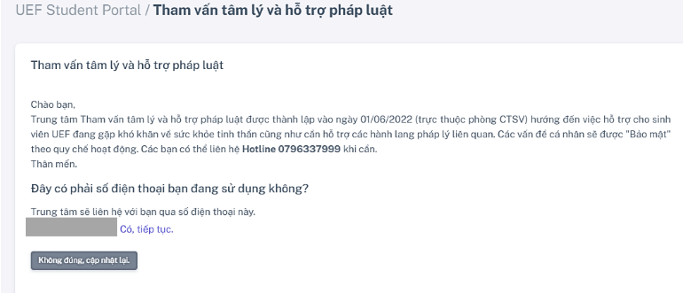Trung tâm Tham vấn tâm lý và Hỗ trợ pháp luật UEF xin thông báo đến các bạn rằng hiện tại trang Student Portal đã tích hợp ứng dụng Đăng ký Tham vấn tâm lý và Hỗ trợ pháp luật, các bạn có thể đăng ký để được Tham vấn tâm lý và Hỗ trợ pháp luật ngay trên Student Portal. Các bạn sinh viên Đại học Kinh tế - Tài chính TP. HCM khi có nhu cầu cần được Tham vấn tâm lý hoặc Hỗ trợ pháp luật đăng ký sẽ được tham vấn, tư vấn miễn phí bởi những chuyên gia của Trung tâm. Các bạn vui lòng xem Hướng dẫn sử dụng như sau: