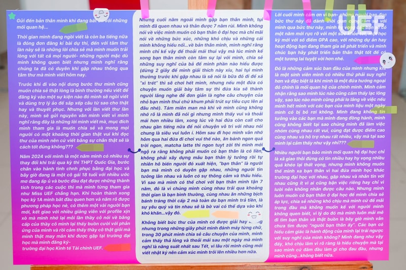 Một trong những lá thư đầy cảm xúc được các bạn sinh viên quan tâm là của bạn Nguyễn Thị Thùy Giang - sinh viên năm nhất ngành Quan hệ quốc tế đã chia sẻ về hai chữ "bạn thân" – không chỉ là một danh xưng mà còn là một mối duyên gặp gỡ, một sự kết nối bền vững dựa trên niềm tin, sự cảm thông và thấu hiểu lẫn nhau. Theo Thuỳ Giang cảm nhận, đó là mối quan hệ sẵn sàng lắng nghe mà không phán xét, là người có thể thoải mái ở bên nhau dù không cần làm gì đặc biệt.