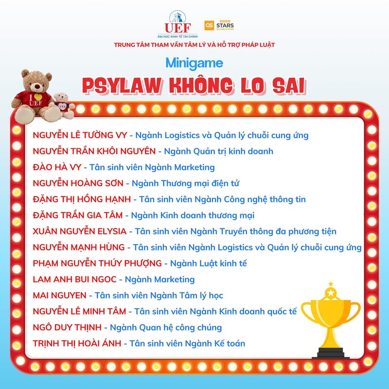 Minigame “PsyLaw - Không lo sai” được tổ chức với mục tiêu tạo sân chơi cho sinh viên UEF, đặc biệt là các bạn tân sinh viên tìm hiểu các thông tin về Trung tâm Tham vấn tâm lý và Hỗ trợ pháp luật và Nhà trường, cũng như những quy định cần nắm rõ trong quá trình học đại học, các kiến thức về tâm lý - pháp luật thường gặp.