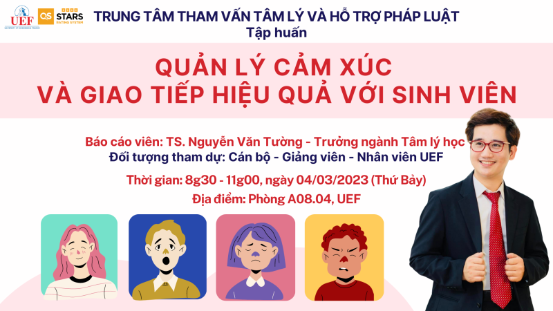 Nhằm giúp đội ngũ giảng viên, nhân viên thực hiện công tác hỗ trợ sinh viên có thể quản lý tốt cảm xúc của bản thân đồng thời bồi dưỡng, nâng cao kỹ năng chuyên môn, kỹ năng giao tiếp, tương tác với sinh viên và xử lý các tình huống cấp bách trong môi trường đại học cũng như mở rộng kết nối với các bên liên quan, vào sáng ngày 4/3 tới đây, Trung tâm Tham vấn tâm lý và Hỗ trợ pháp luật UEF sẽ tiếp tục tổ chức chương trình tập huấn công tác hỗ trợ sinh viên cho các thầy, cô.