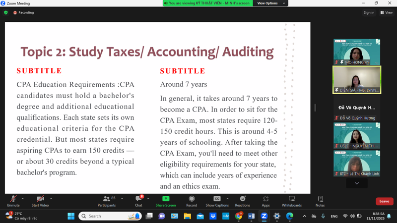 Working in the field of taxation in the United States requires extensive certifications and diverse practical experience. Speaker Lynn Huynh provided detailed information to students about the path to conquering the CPA certificate— crucial credential for roles related to accounting, auditing, and taxation. Additionally, she shared intriguing real-life stories about the profession by addressing students' queries.