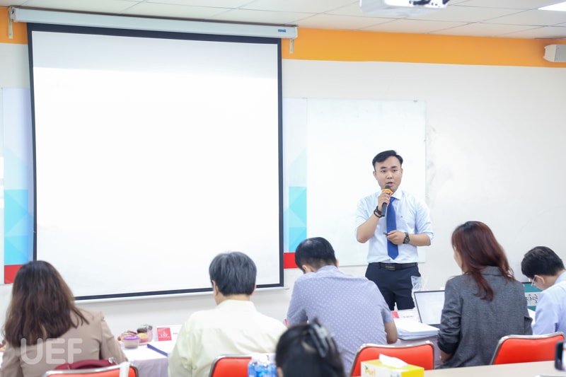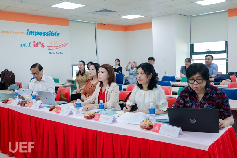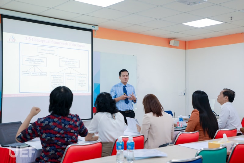 Chiều cùng ngày, Hội đồng đánh giá luận văn cũng đã diễn ra do TS. Phạm Huy Cường - Trưởng Khoa Tiếng Anh UEF làm Chủ tịch cùng các thành viên: PGS.TS. Phạm Hữu Đức, TS. Nguyễn Thị Quyên, PGS.TS. Trần Quốc Thao và TS. Lưu Thị Mai Vy.