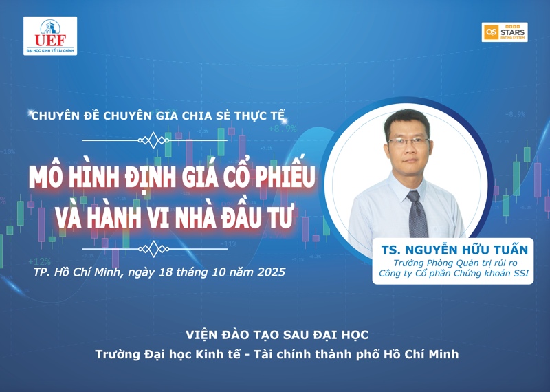 Sáng ngày 18/10/2025, Viện Đào tạo sau đại học - Trường Đại học Kinh tế - Tài chính TP. Hồ Chí Minh (UEF) sẽ tổ chức buổi chuyên đề thực tiễn với chủ đề: “Mô hình định giá cổ phiếu và hành vi nhà đầu tư”, dành cho học viên cao học ngành Tài chính - Ngân hàng. Chương trình có sự tham gia của diễn giả TS. Nguyễn Hữu Tuấn, Trưởng phòng Quản trị rủi ro, Công ty Cổ phần Chứng khoán SSI.